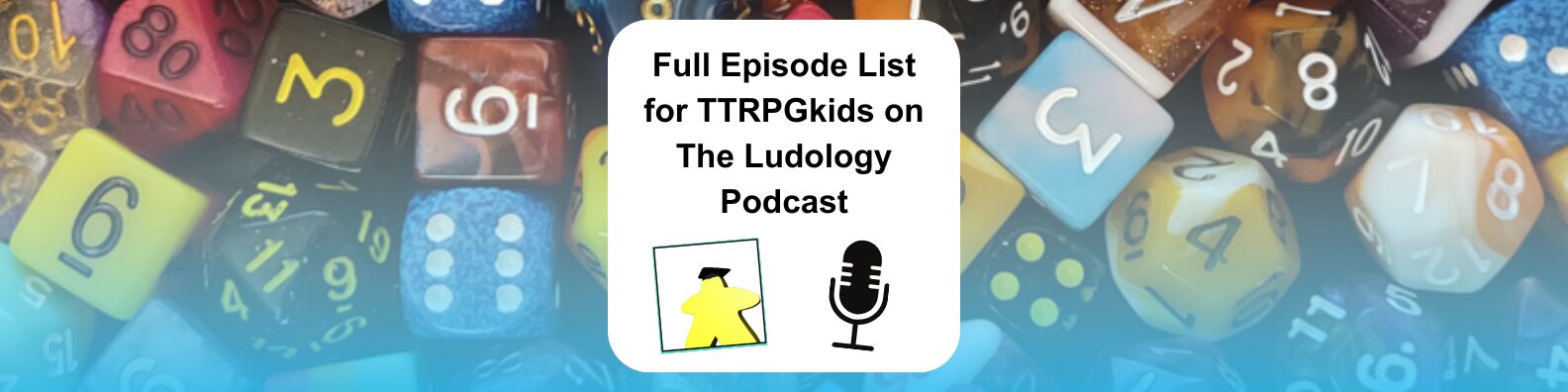 From June 2023 – June 2025, TTRPGkids had a guest spot on The Ludology Podcast talking about all-ages tabletop RPGs (season 1) and using TTRPGs for educational purposes (season 2). This list is to help with finding episodes that cover the topics you want to learn about and see what all was covered across the 24 episode run!